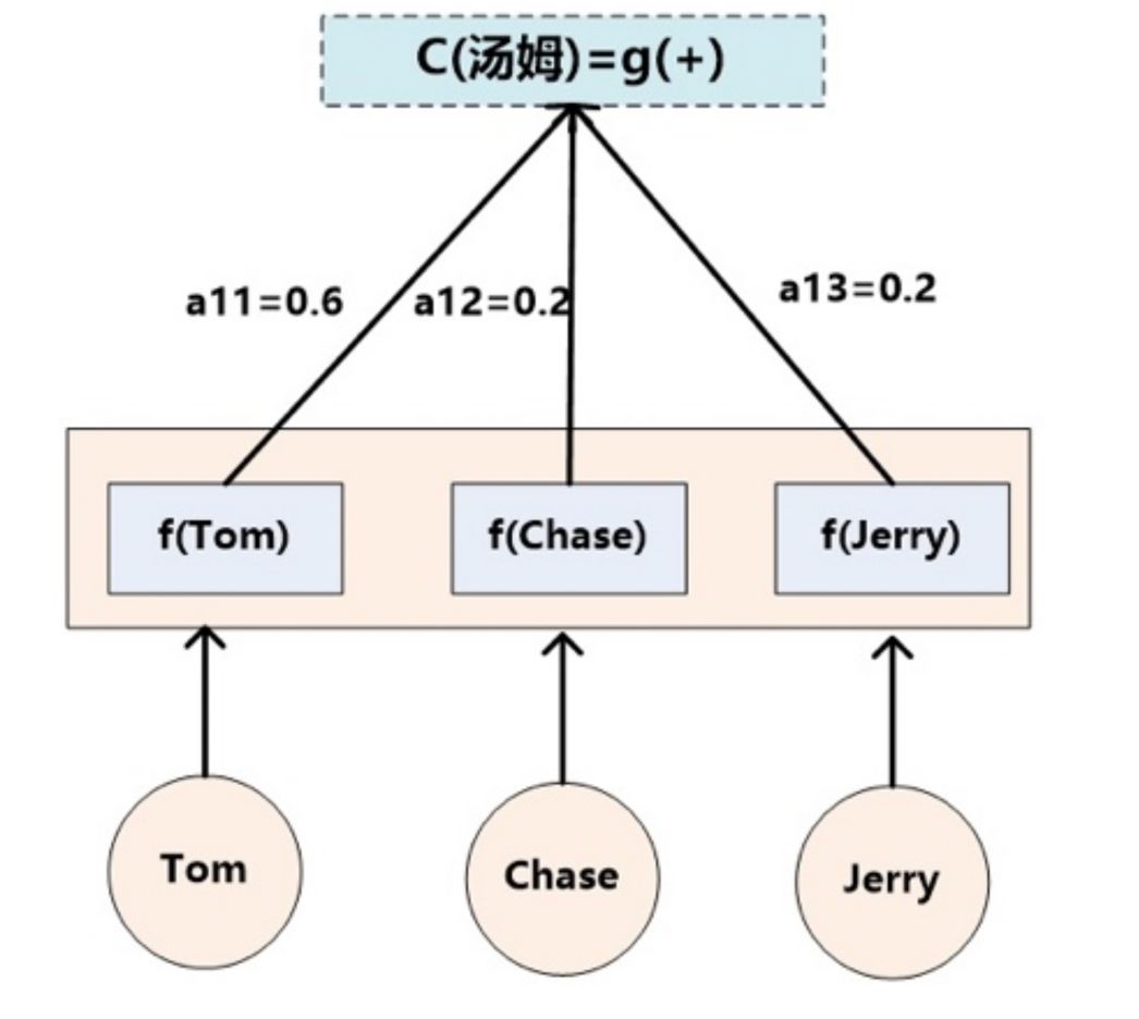 - Lx代表输入句子source的长度, a_ij代表在Target输出第i个单词时source输入句子中的第j个单词的注意力分配系数, 而hj则是source输入句子中第j个单词的语义编码, 假设Ci下标i就是上面例子所说的'汤姆', 那么Lx就是3, h1=f('Tom'), h2=f('Chase'),h3=f('jerry')分别输入句子每个单词的语义编码, 对应的注意力模型权值则分别是0.6, 0.2, 0.2, 所以g函数本质上就是加权求和函数, 如果形象表示的话, 翻译中文单词'汤姆'的时候, 数学公式对应的中间语义表示Ci的形成过程类似下图3: