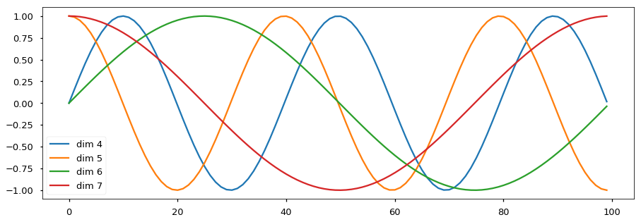 # 第0个句子的,所有单词的,绘制4到8维度的特征 看看sin-cos曲线变化