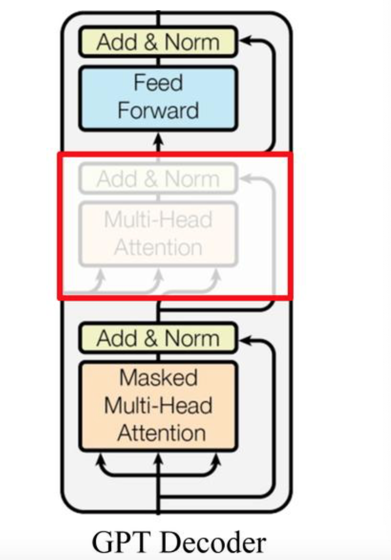 - 如上图所示, 经典的Transformer Decoder Block包含3个子层, 分别是Masked Multi-Head Attention层, encoder-decoder attention层, 以及Feed Forward层. 但是在GPT中取消了第二个encoder-decoder attention子层, 只保留Masked Multi-Head Attention层, 和Feed Forward层.