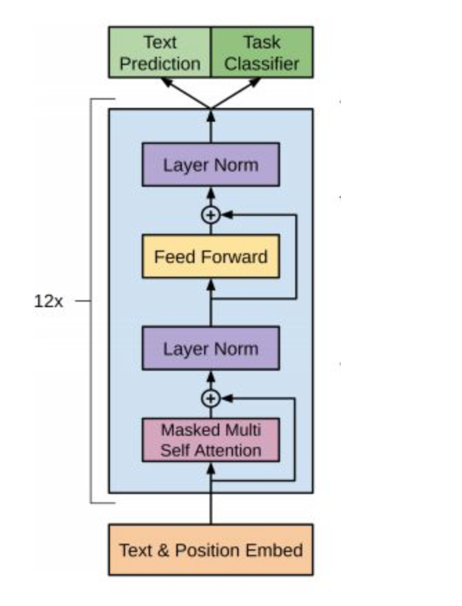 - 作为两大模型的直接对比, BERT采用了Transformer的Encoder模块, 而GPT采用了Transformer的Decoder模块. 并且GPT的Decoder Block和经典Transformer Decoder Block还有所不同, 如下图所示: