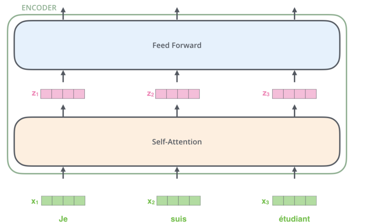 - 上图第三层蓝色的部分, 也就是前馈全连接层, 对于不同的向量z之间也是没有依赖关系的, 所以这一层是可以实现并行化处理的. 也就是所有的向量z输入Feed Forward网络的计算可以同步进行, 互不干扰.
